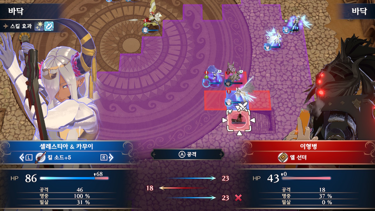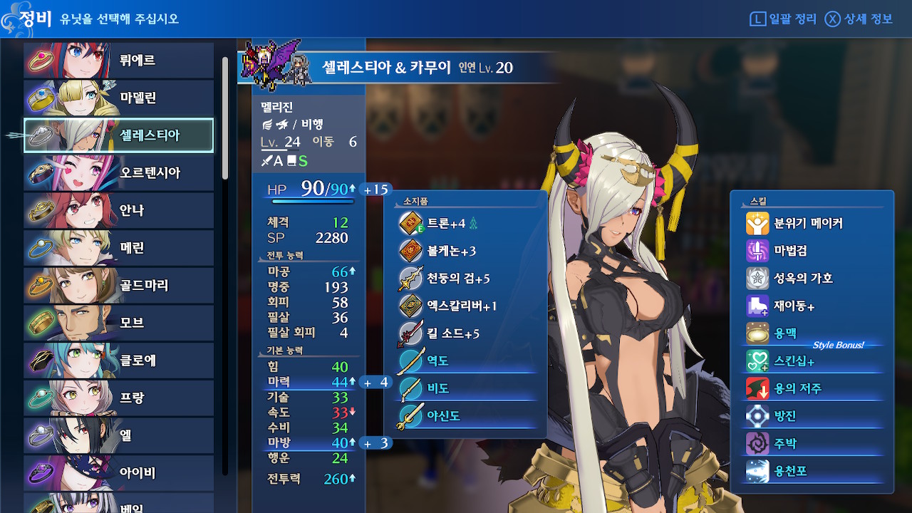 개요 : 아이비와 더불어 게임 내 유이한 비병+마도서S 유닛. 행운을 제외하고 전반적으로 안정적인 성장을 할 수 있습니다. 아이비와의 차이점은 딜러로서는 셀레스티아가 더 좋지만, 지팡이를 사용할 수 없다는 것입니다. 고유 패시브 분위기 메이커는 셀레스티아로 막타를 먹으면, 주위 2칸 이내의 유닛들의 명중이 1턴간 20이나 상승시켜줍니다. 따라서 명중이 좀 아쉬운 유닛(마델린, 디아만드, 아이비, 라팔, 기타 도끼를 사용하는 유닛들)과의 궁합도 좋은 편입니다.