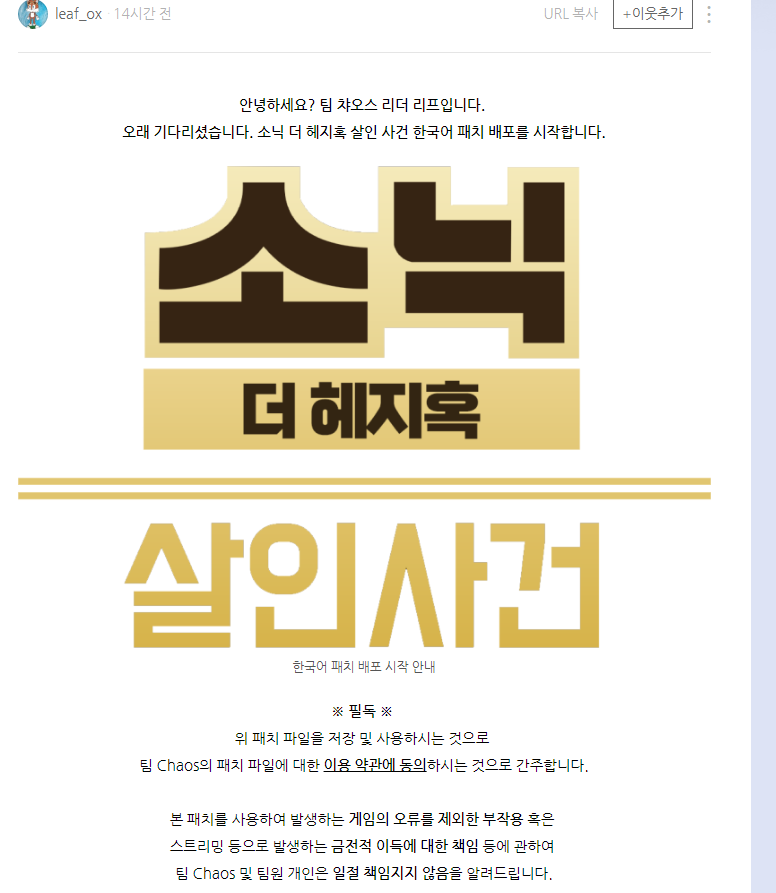 소닉 더 헤지혹 살인 사건 한국어 패치 배포 .. : 네이버블로그 (naver.com)