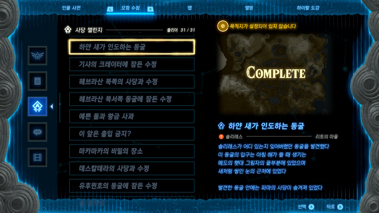 npc를 통해서 퀘스트를 받지 않아도 사당을 클리어할 수 있다보니, 자칫하면 사당 올클리어를 해도 31/31이 안될 수가 있습니다. 제 경우에는 하얀 새가 인도하는 동굴퀘가 그런 경우였습니다(퀘스트를 안받고 클리어 했더니 30/31이 떠서, 사당 챌린지 리스트를 보면서 일일히 대조를 했습니다).
