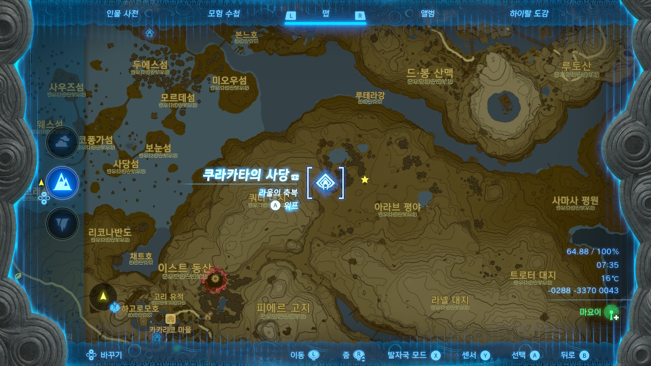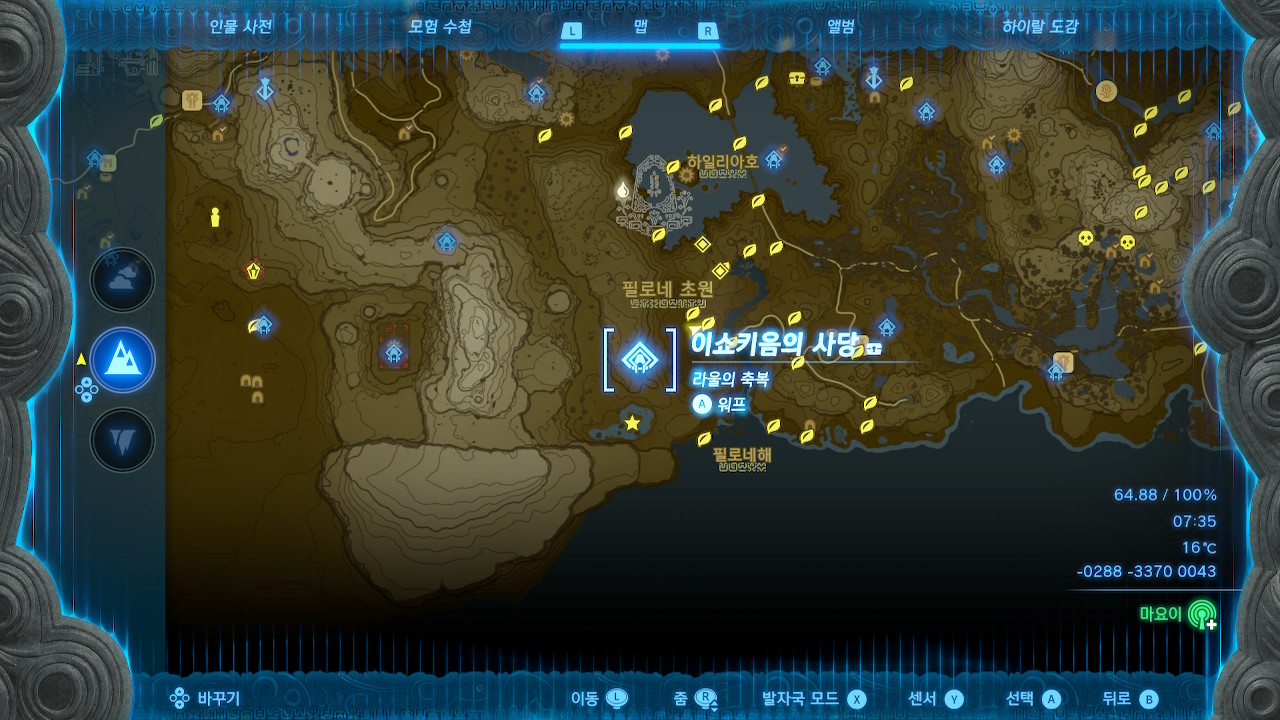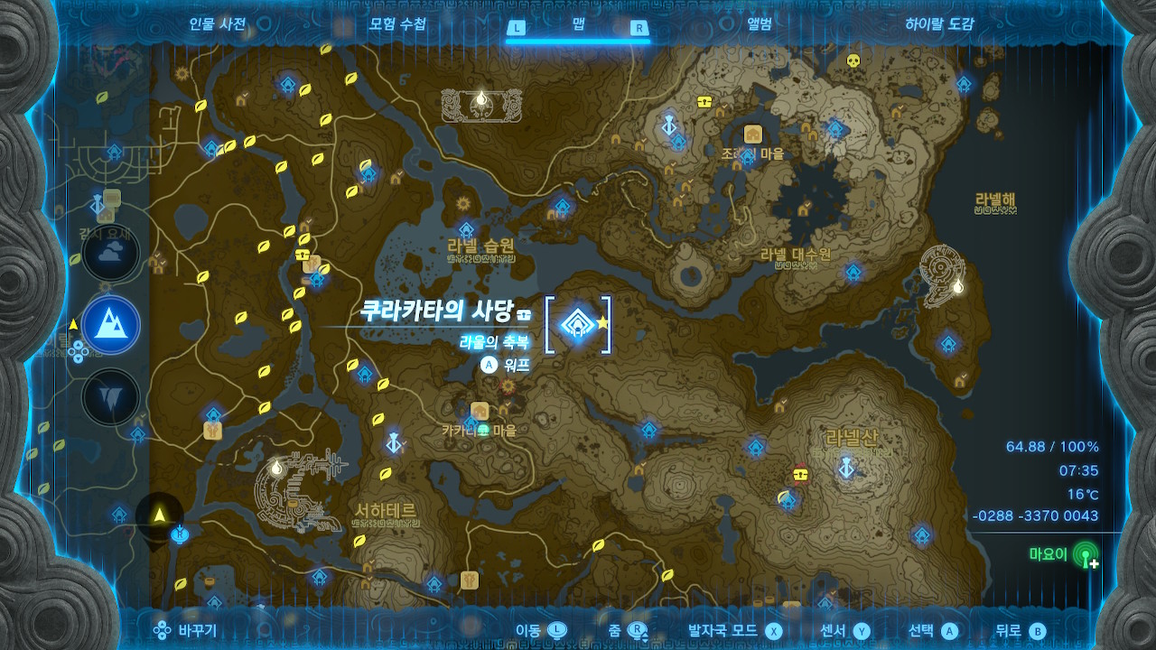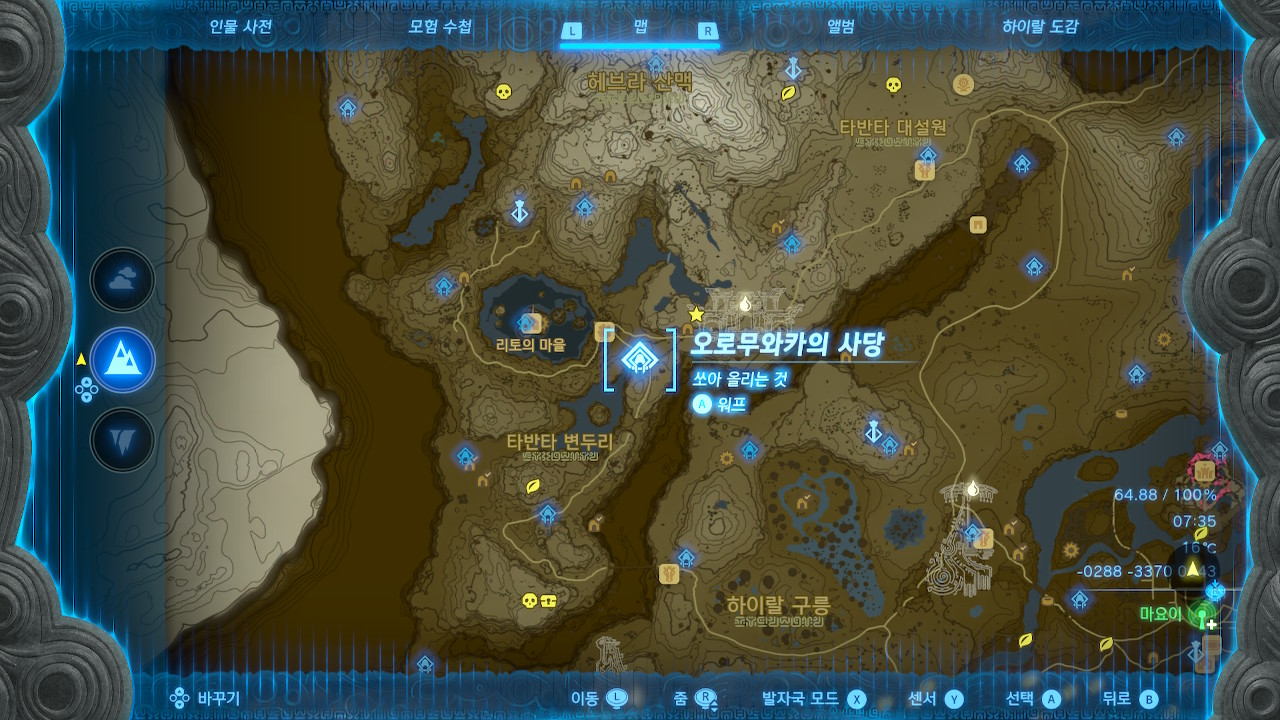 오로무와카의 사당에서 반대편 절벽까지는 거리가 좀 먼 편이라서, (스태미너를 풀강한게 아니라면 등반을 너무 오래 해야 함) 비행용 조나우 기어를 사용해서 넘어가거나 다른 경로로 이동해야 할 겁니다.