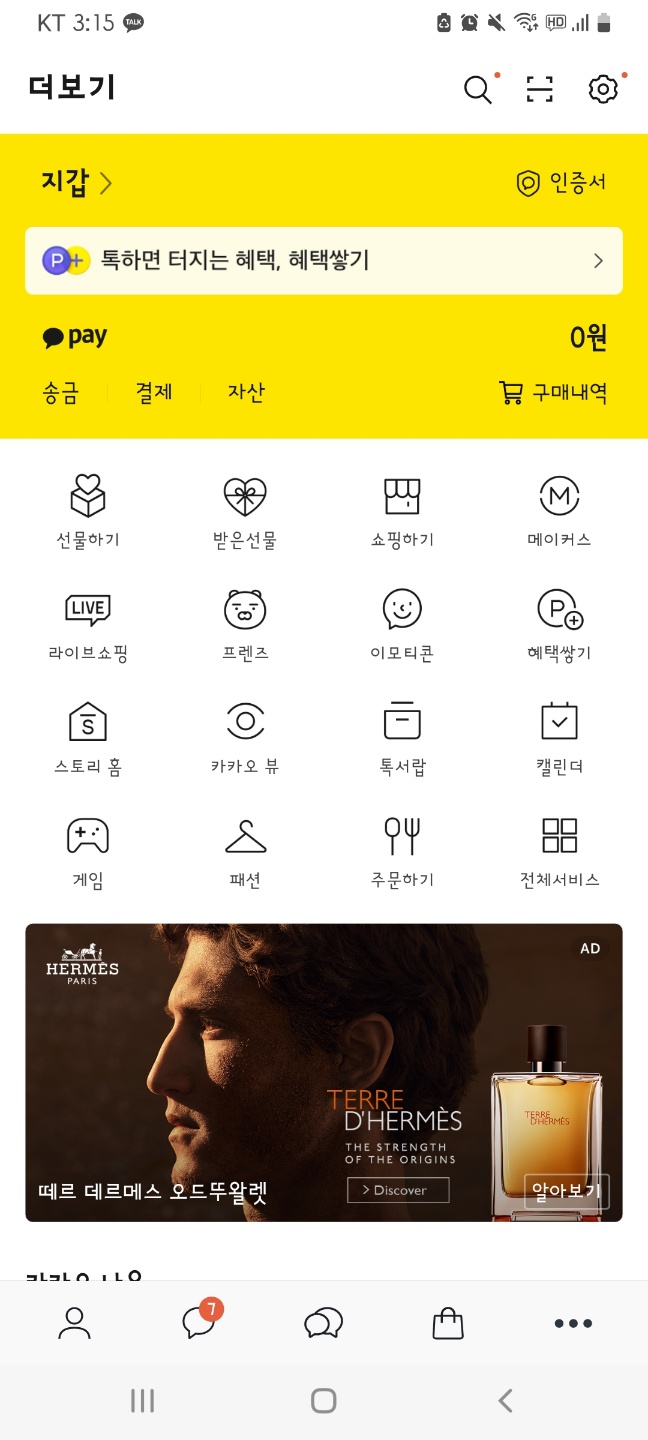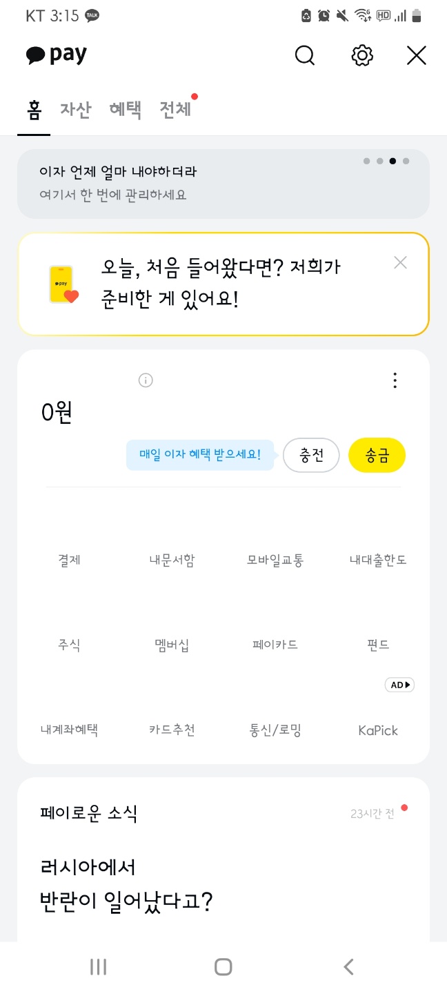 카톡 > 하단의 점 세개 터치(더보기) > 더보기 탭으로 이동 > 상단의 Pay 터치