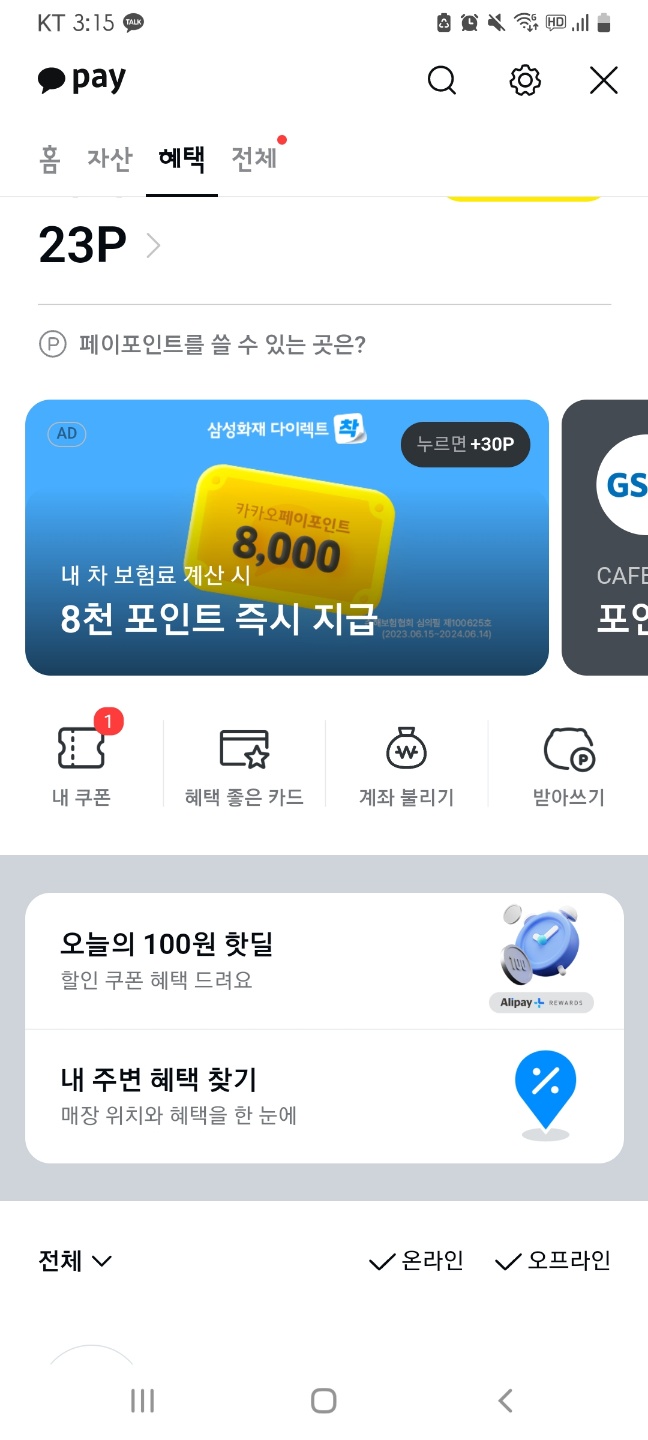 상단의 혜택 터치(홈, 자산, 혜택, 전체 중)