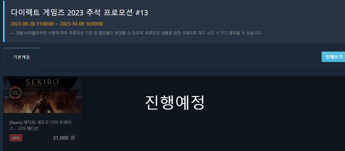 할인 중인 모든 게임이 프로모션 페이지에 나오는 건 아니라서, "전체보기" 혹은 게임명을 직접 검색해 볼 필요가 있습니다.