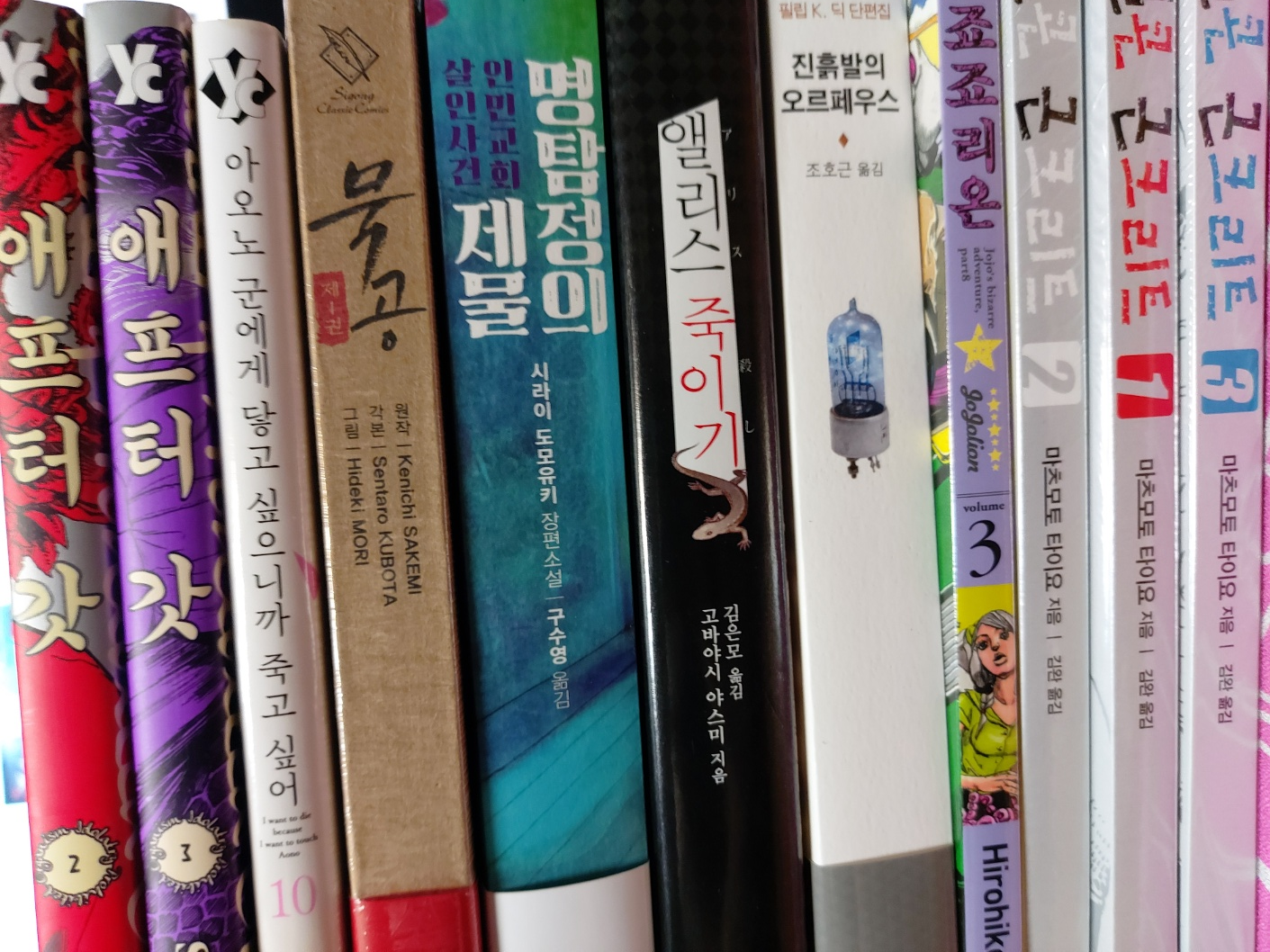 불법 번역본으로 봤었던 죠죠 4부, 5부를 완결까지 스트레이트로 보고 싶다. 하지만 어째선지 문동은 5부보다 스톤오션을 먼저 찍고 있는 중이라, 8부를 찔끔 구매. 물론 스톤 오션도 재밌지만, 캐릭터들 취급이 영 안좋다보니 마냥 즐겁게 볼 수 있을 것 같진 않아서 구매 후순위로 둠.