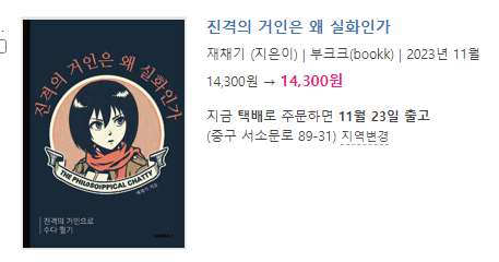 내용이 살짝 궁금하긴한데, 제가 진격의 거인 원작을 엄청 좋아하는 편도 아니고, 수중에 14300원이 없어서 구매는 못하겠습니다.
