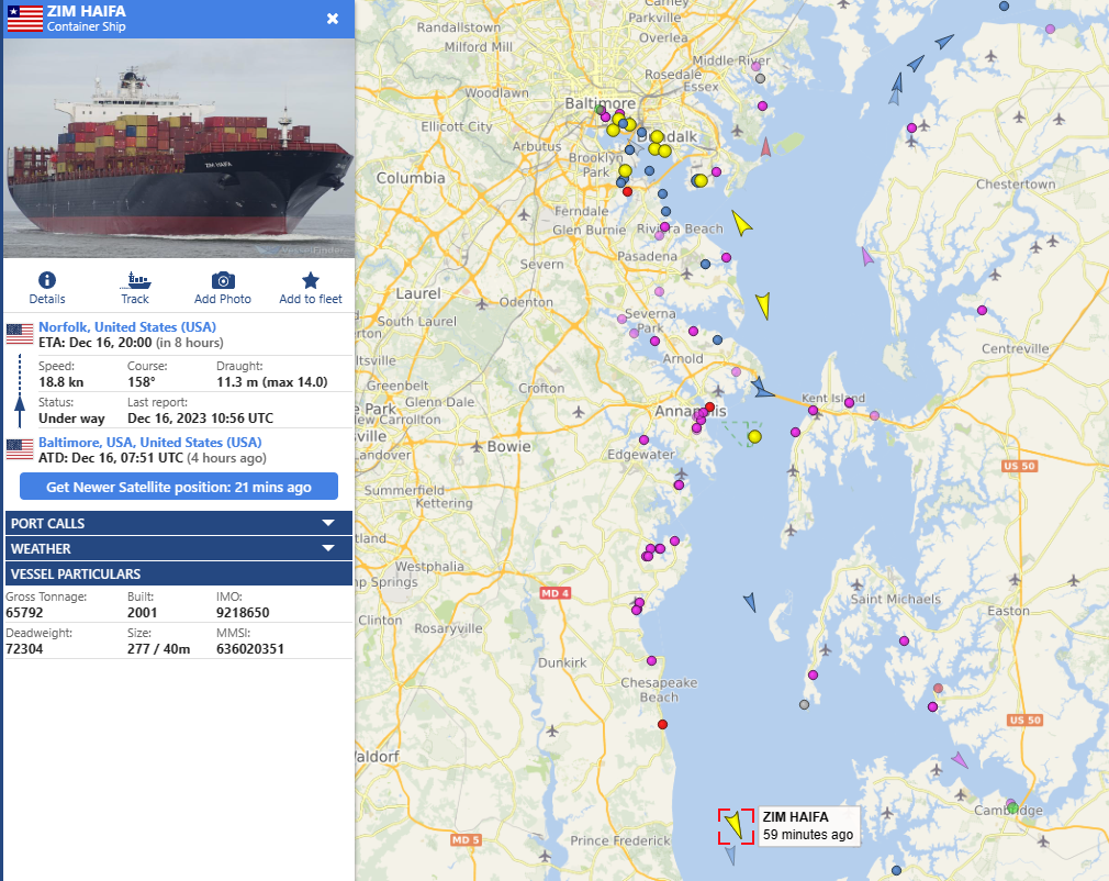 파나마 운하에서 똥꼬쇼를 하던 Zim Haifa가 며칠 전에 포인트 브리즈항에 도착했고, 오늘부로 하선까지 끝낸 걸로 확인이 됩니다.(현재 볼티모어 포인트 브리즈항에서 노스포크로 이동 중)