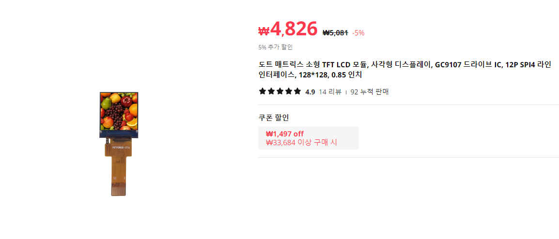 그 외 알리익스프레스에서 " GC9107 128*128 0.85 인치" 등으로 검색하면 호환되는 제품들이 나옵니다.