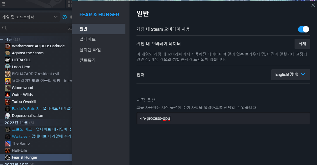 2-2. 하단의 시작 옵션에 -in-process-gpu 를 입력합니다.