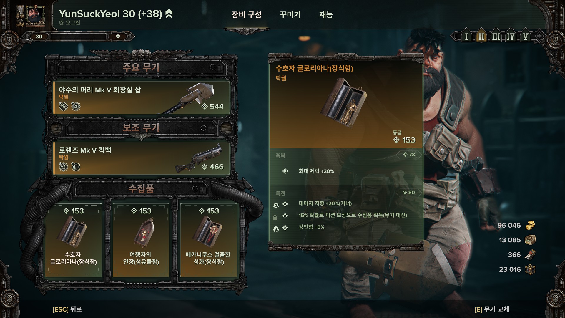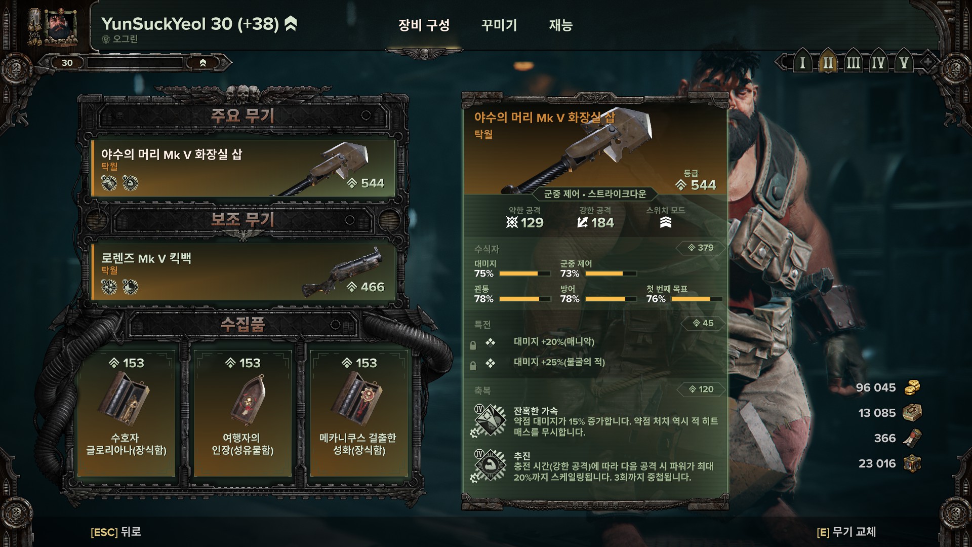 수집품 축복은 체+20%, 강인함+17%를 취향에 따라 넣다 뺐다 하시면 됩니다.