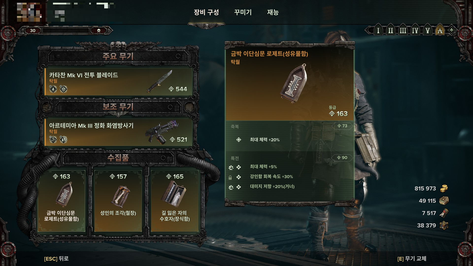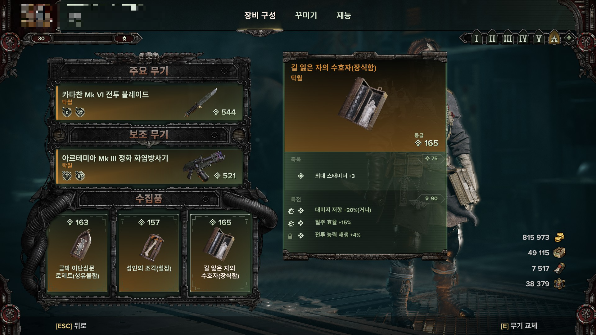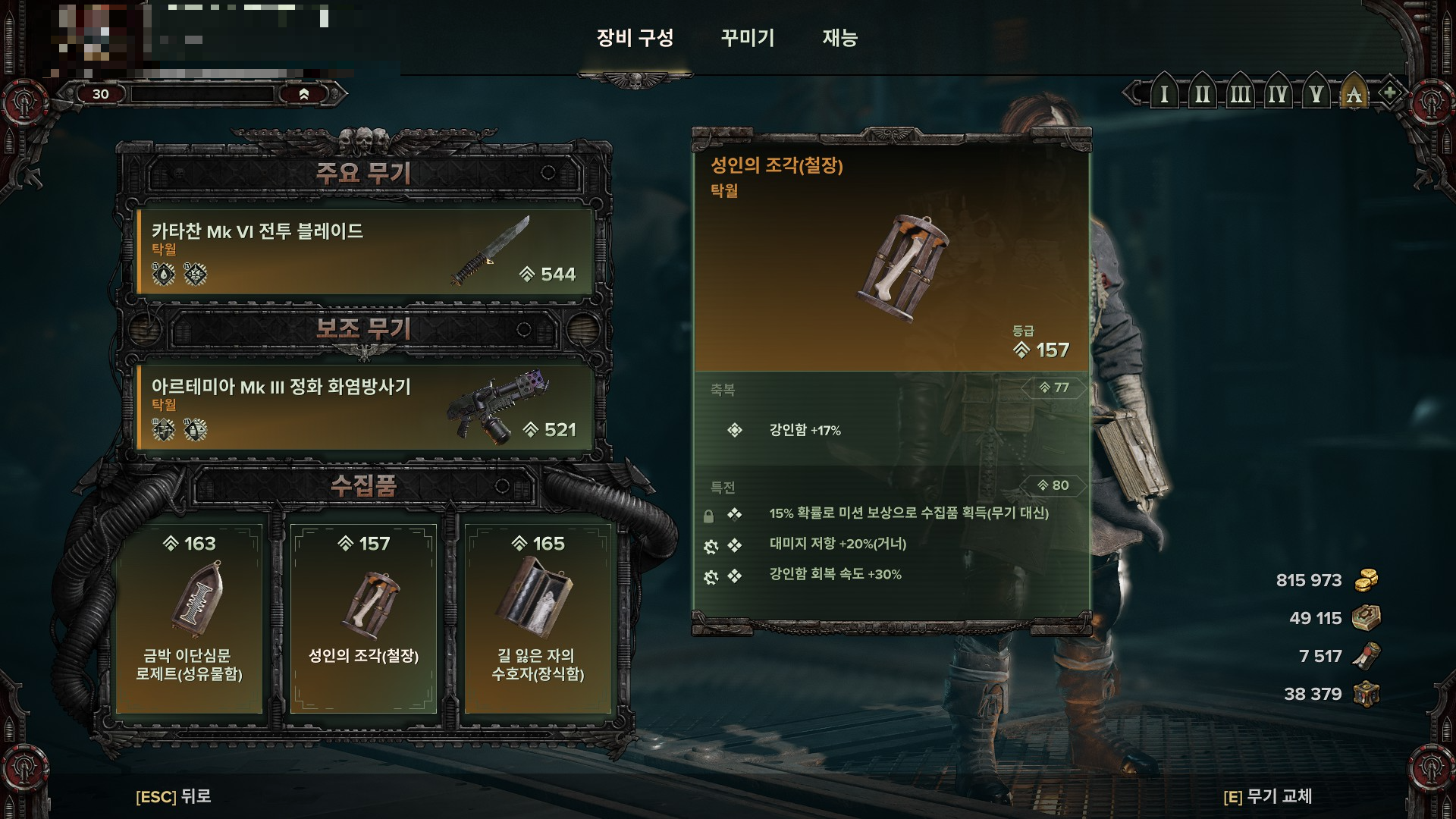 수집품은 플레이 스타일에 따라 다르게 가져가세요. 단검은 밀치기와 반격을 많이 넣어야 하기 때문에 스태미너+3 장신구를 최소 한개는 챙기는걸 추천드립니다. 아 모르겠다 싶으면(?) 체스강. 취향에 따라 스스스, 스스체, 스스강 취사 선택.