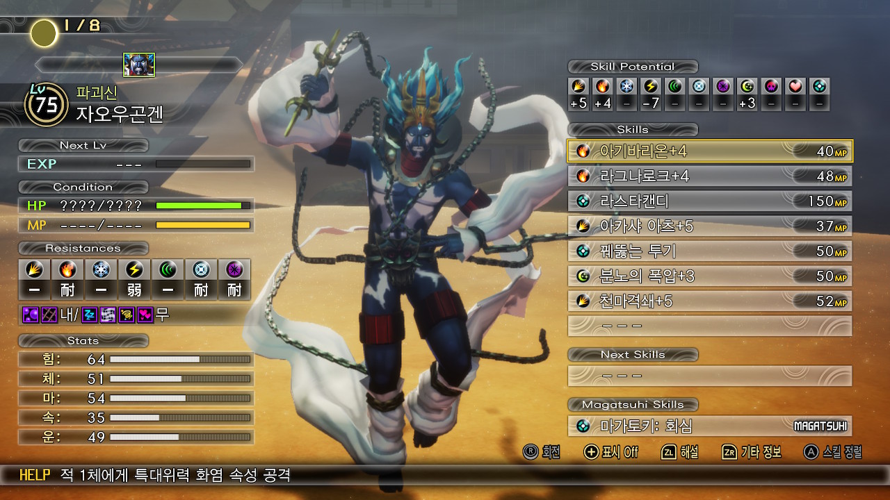 기술은 그야말로...좋은 말로 올라운더, 나쁜 말로 스까무라 토탈패키지. 레벨만 높고 스킬은 개판인 상황.
