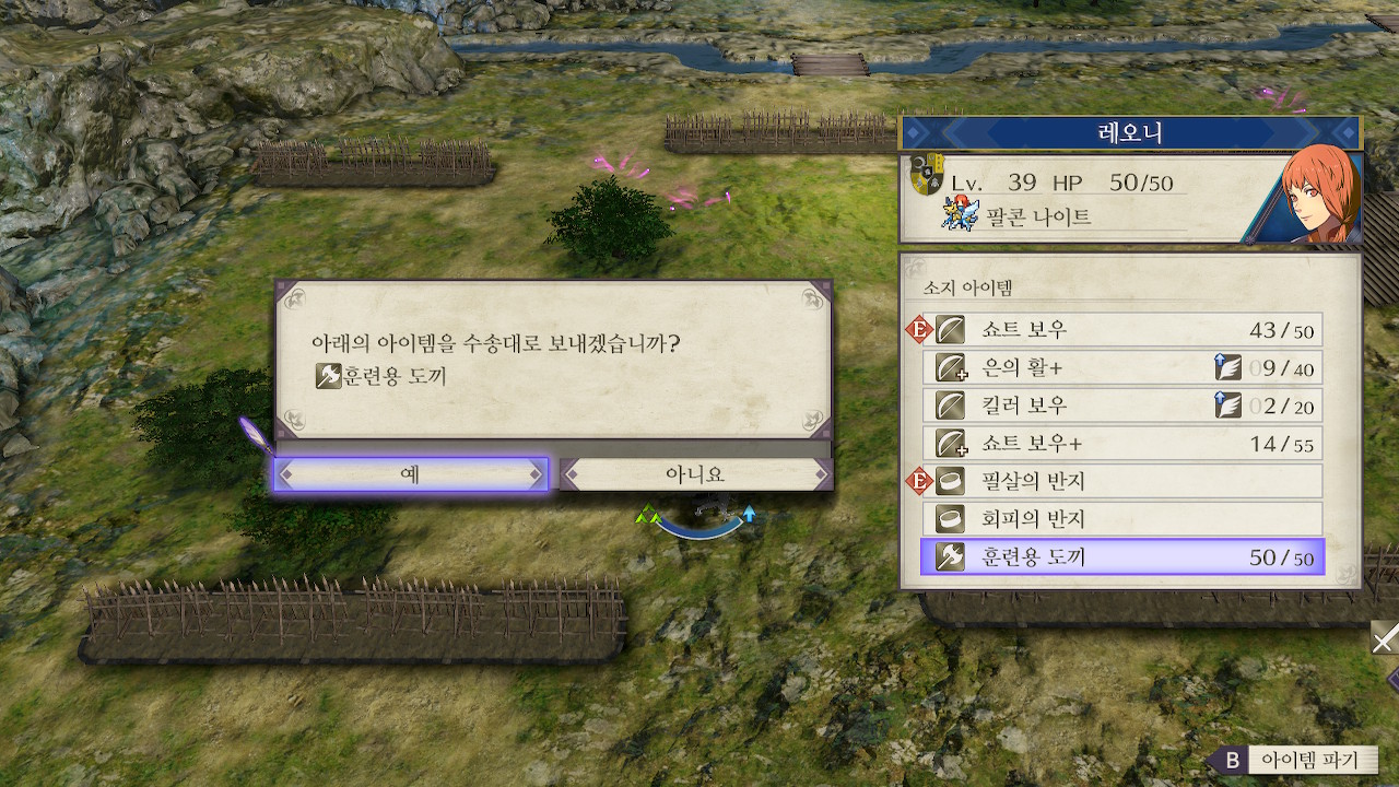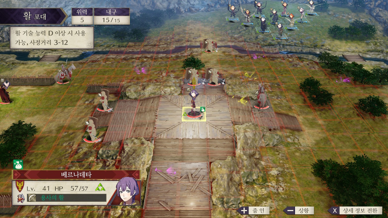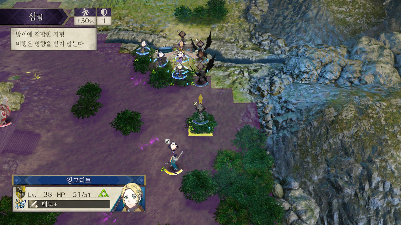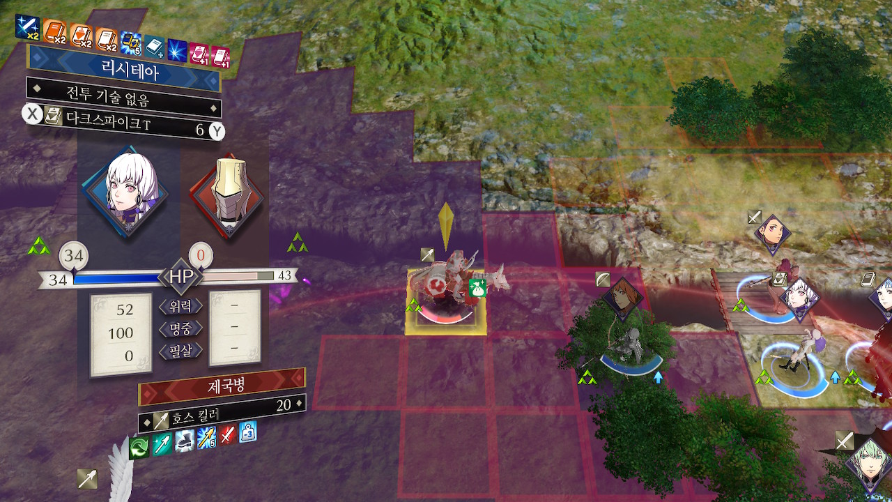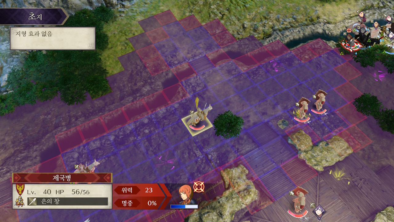 왕국군 뿐만 아니라 제국군도 달려들기때문에 레오니의 무기를 숏보우로 바꿔주고, 수풀에서 내리기를 사용한 후 경계 태세를 발동시켜주세요(근거리 반격을 쓰고 있다면 굳이 숏보우로 안바꿔도 됩니다).