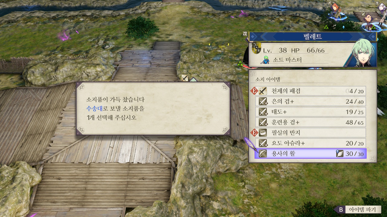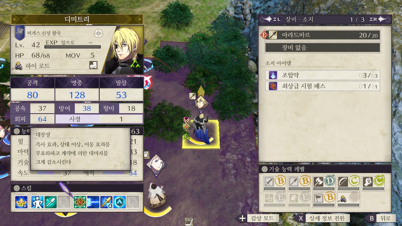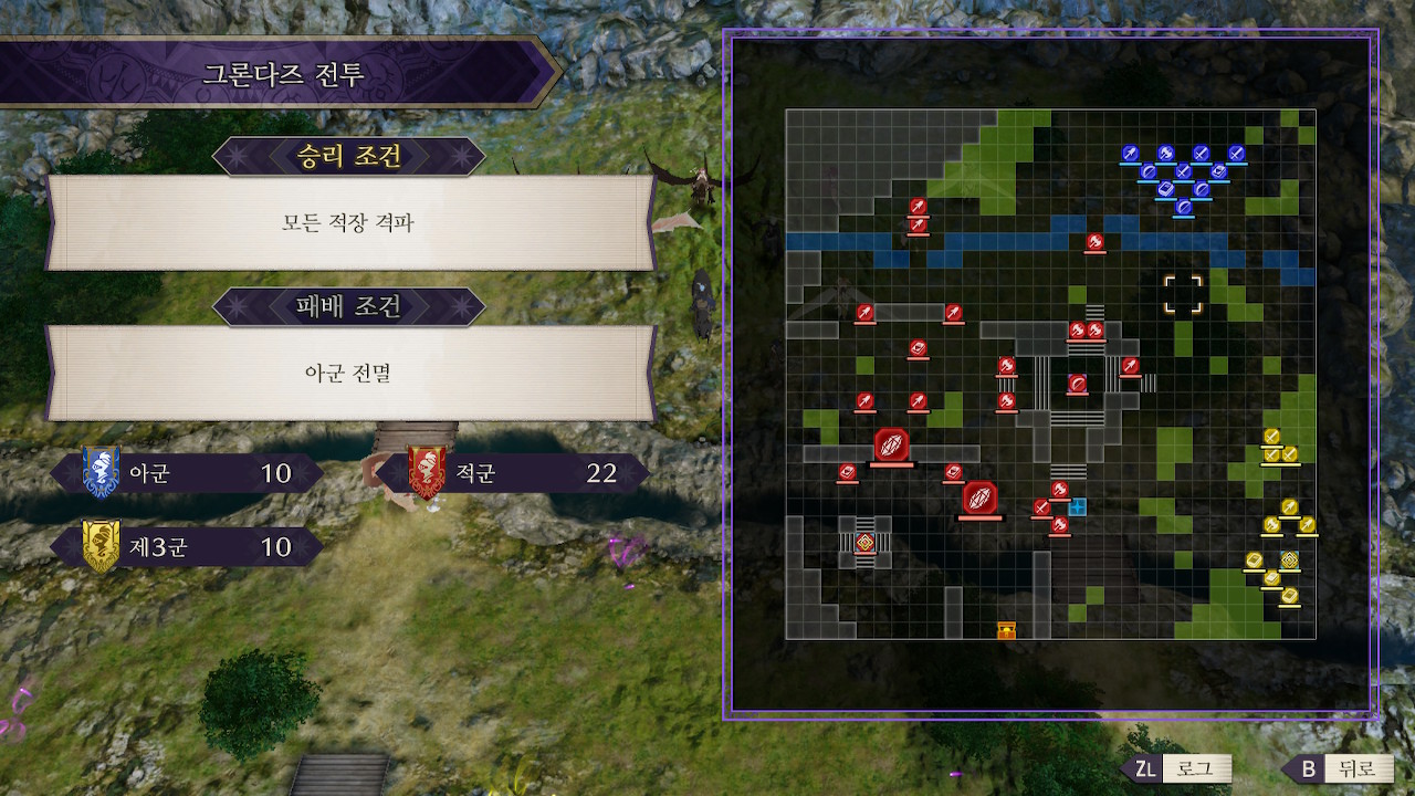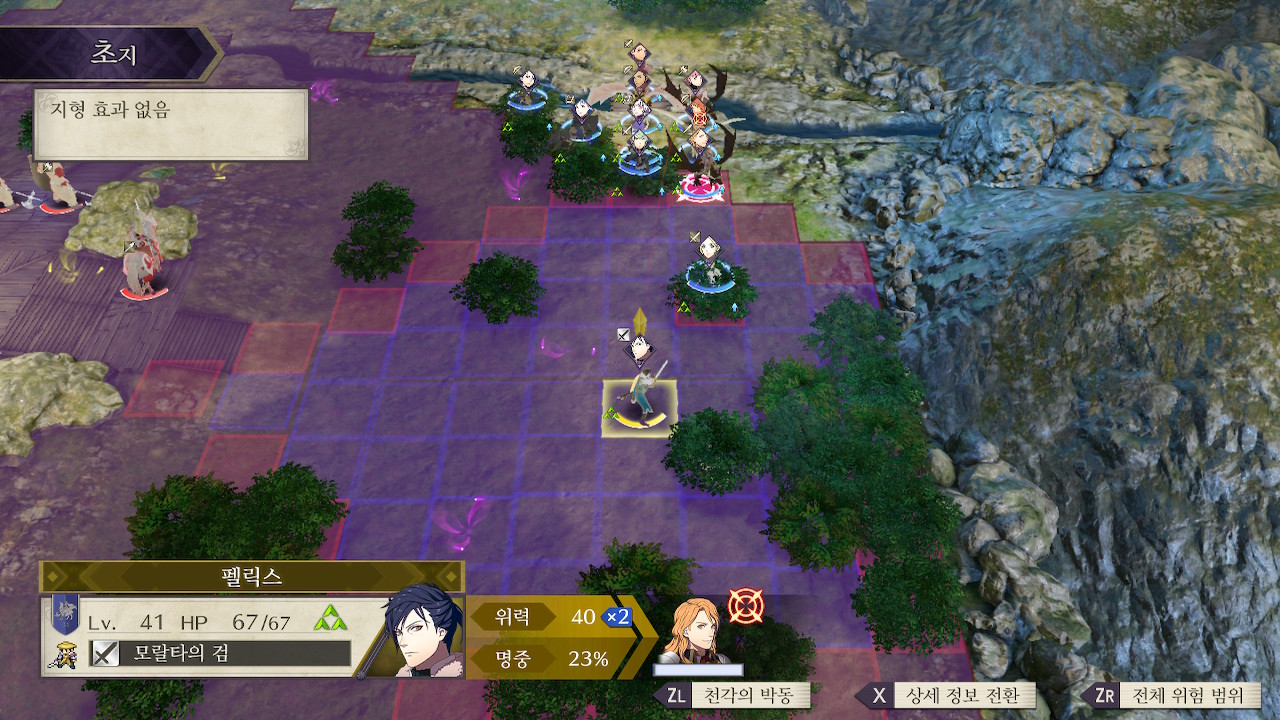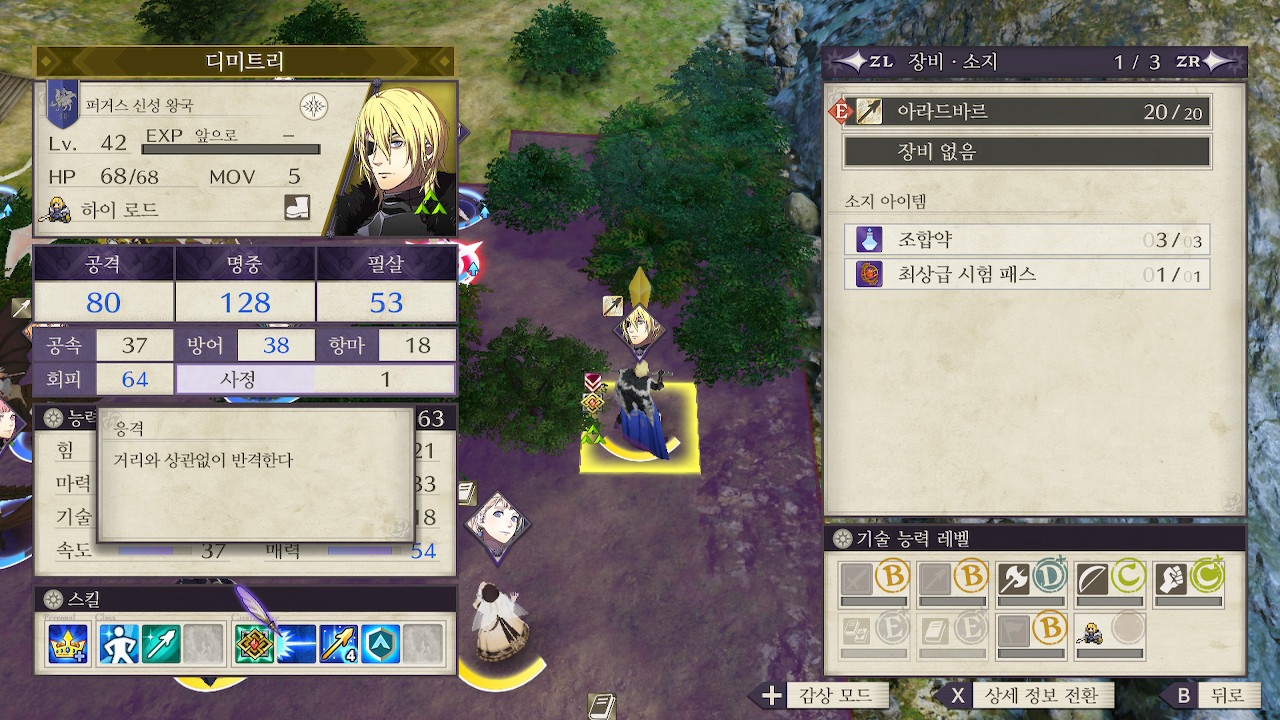 왕국군 뿐만 아니라 제국군도 달려들기때문에 레오니의 무기를 숏보우로 바꿔주고, 수풀에서 내리기를 사용한 후 경계 태세를 발동시켜주세요(근거리 반격을 쓰고 있다면 굳이 숏보우로 안바꿔도 됩니다).