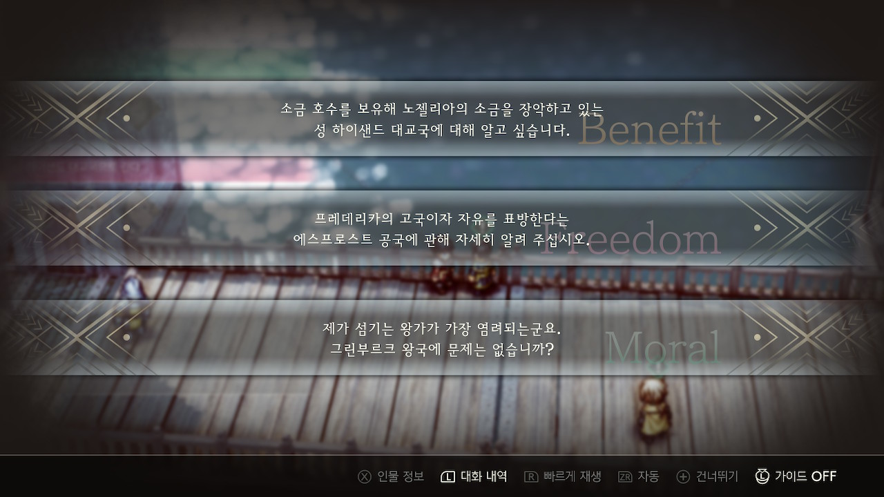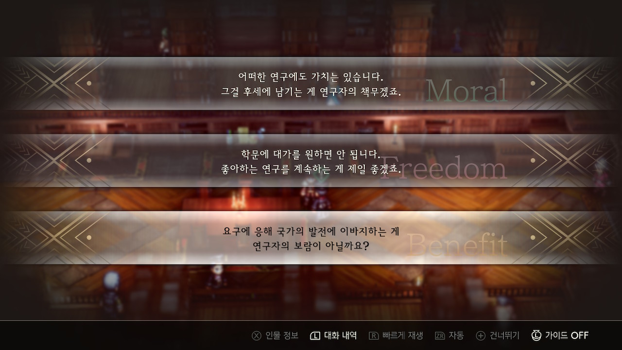이럴 때는 직접 나서서 설득을 해야하는데, 일반적으로 2가지 선택지가 떠 있고, 플레이어의 신념 수치에 따라서 세번째 선택지가 해금되는 식입니다. 여기서 설득을 하려면 해금된 선택지를 고르시면 됩니다.