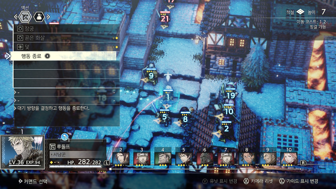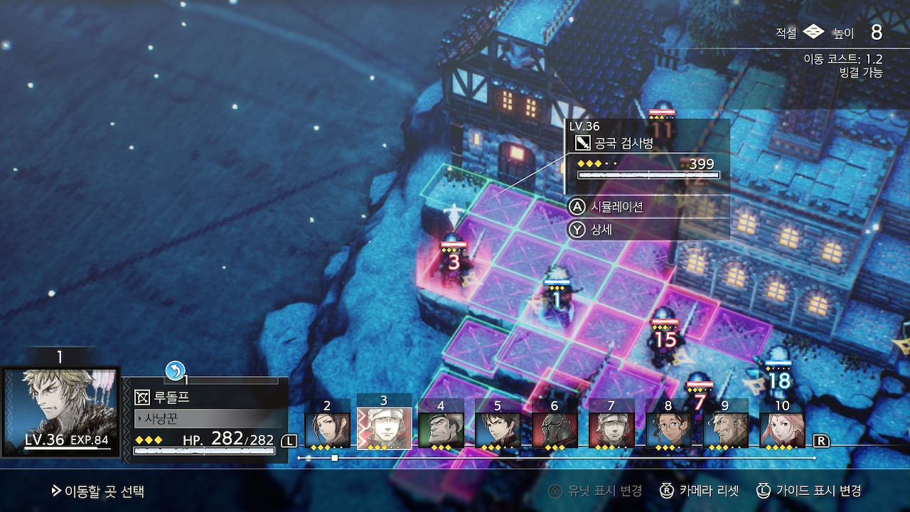 그 다음에 루돌프의 턴이 오면, 주변 적들의 이동거리와 공격범위를 확인한 후 아래 스샷의 위치로 이동시킵니다.