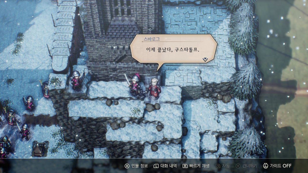 전투가 시작되자마자 아군을 특별히 이상하게 이동시켜서 적의 어그로를 끄는 경우가 아니라면, 스바로그는 얌전하게 남쪽으로 내려옵니다.