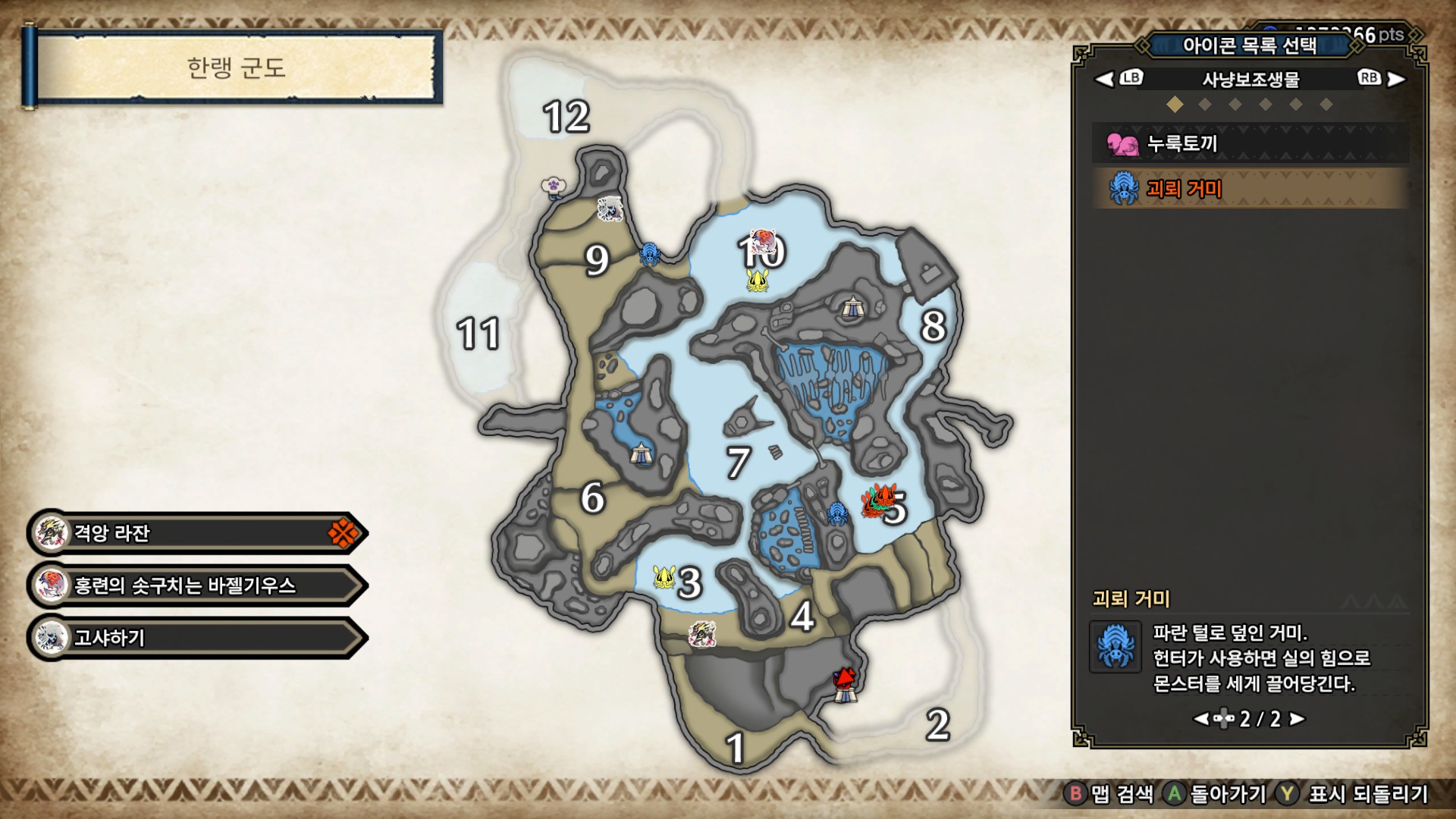 한랭 군도의 경우 10~20초 정도를 투자해서 초록 인혼조 세마리와 괴뢰 거미 1마리를 먹을 수 있습니다.