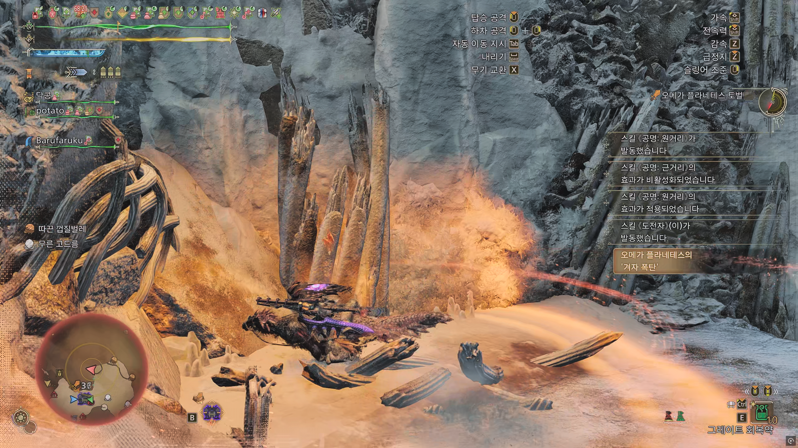 따라서 헌터들은 오메가의 다리 대각선 바깥에 자리를 잡아야 합니다.(탱커도 되도록이면 왼쪽, 오른쪽 앞다리 대각에 위치하거나 계속 그 방향으로 이동하면서 싸우는 것을 추천)