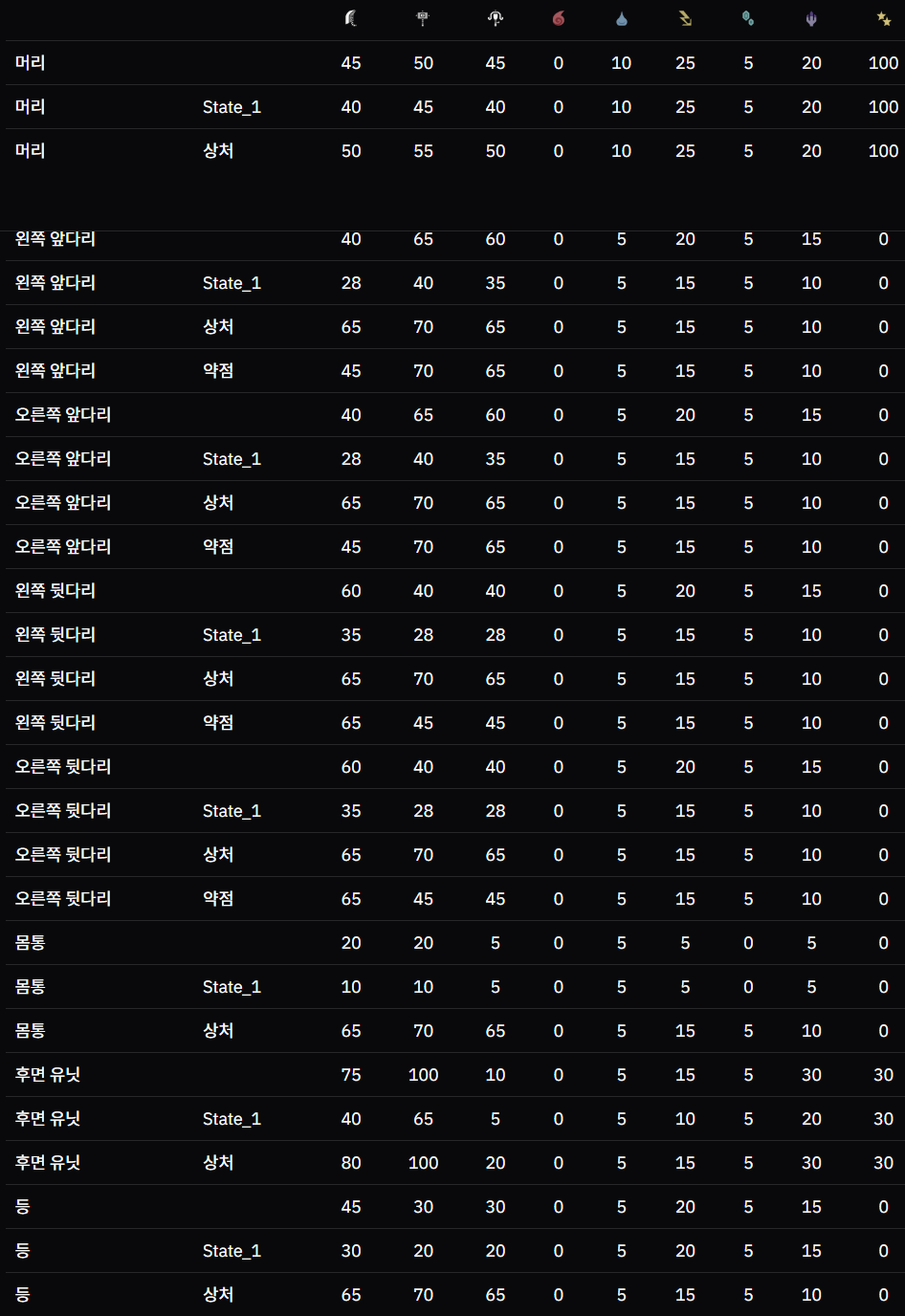 간단하게 요약하면 참격 무기는 뒷다리, 타격 무기는 머리&앞다리, 원거리는 앞다리와 머리입니다.
