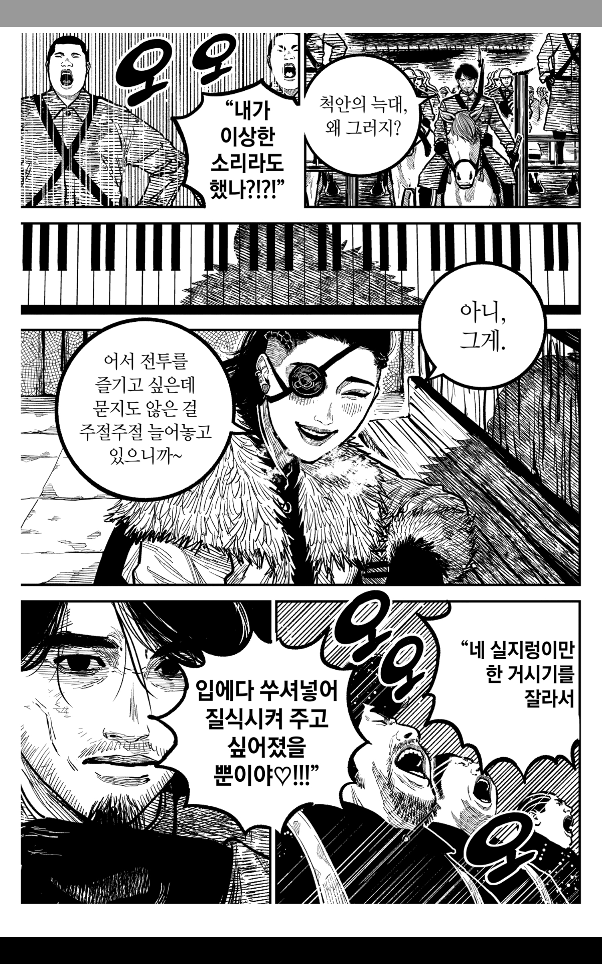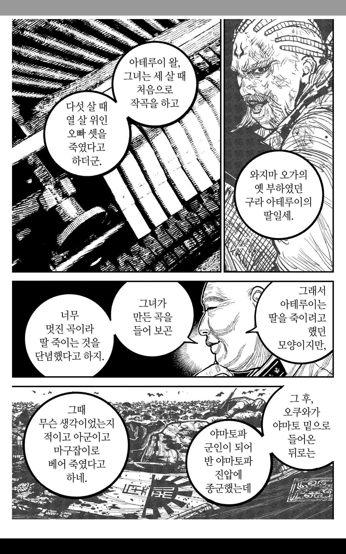 오빠 셋을 죽이면서 얻은 영감으로 작곡을 하고 애비한테 칭찬받기