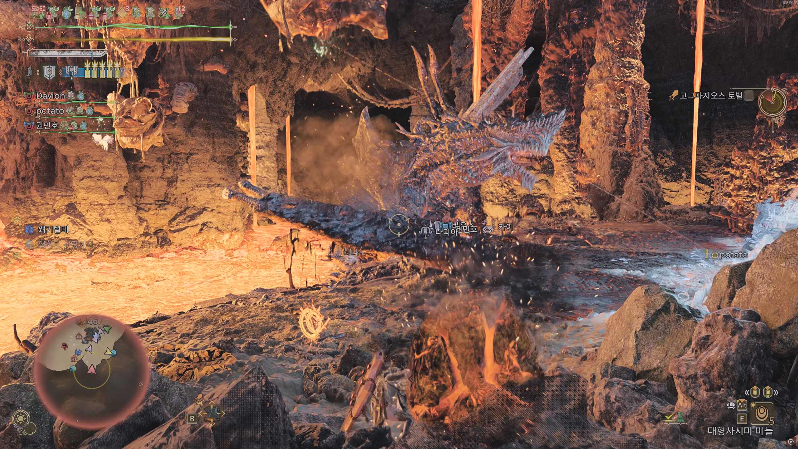낙석 2개, 용암 분출(소폭, 건랜스 포격 등으로 활성화 가능) : 맵을 둘러보시면 낙석 2개와 용암 분출 지점이 있습니다. 해당 기믹을 사용하는건 필수는 아니라서, 위치만 확인해놨다가 상황이 허용될 때만 사용하는걸 추천드립니다