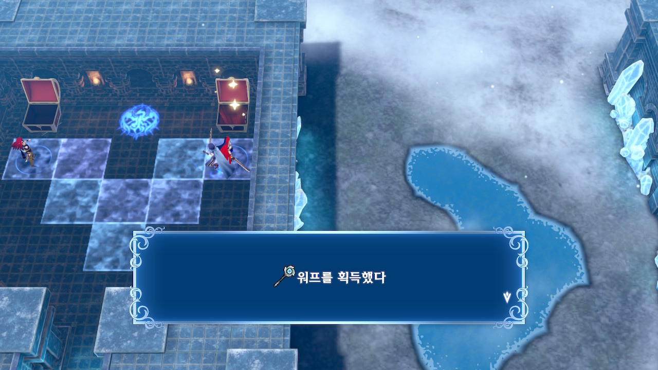 ② : 왼쪽 보물상자는 레스큐 지팡이(아군을 사용자 옆으로 불러들이는 효과), 오른쪽 보물상자는 워프 지팡이. 마법진 위에 유닛을 올려놓으면 치키가 있는 방의 봉인이 해제됨.
