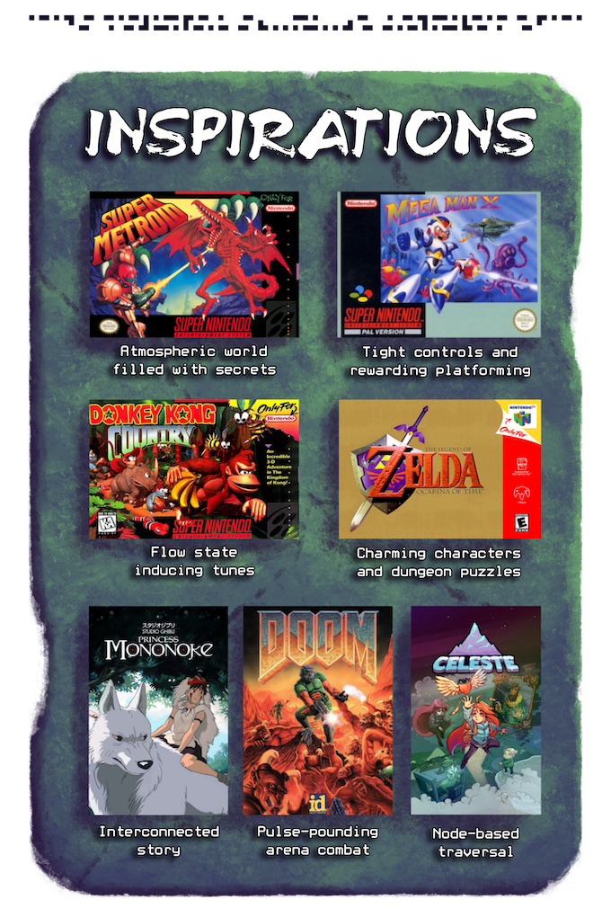 제작자피셜, 수퍼 메트로이드(분위기, 숨겨진 요소들), 록맨x(정밀 조작, 플랫포밍), 동키콩(?), 젤다, 원령공주, 둠, 셀레스테에서 영감을 받았다고 합니다.